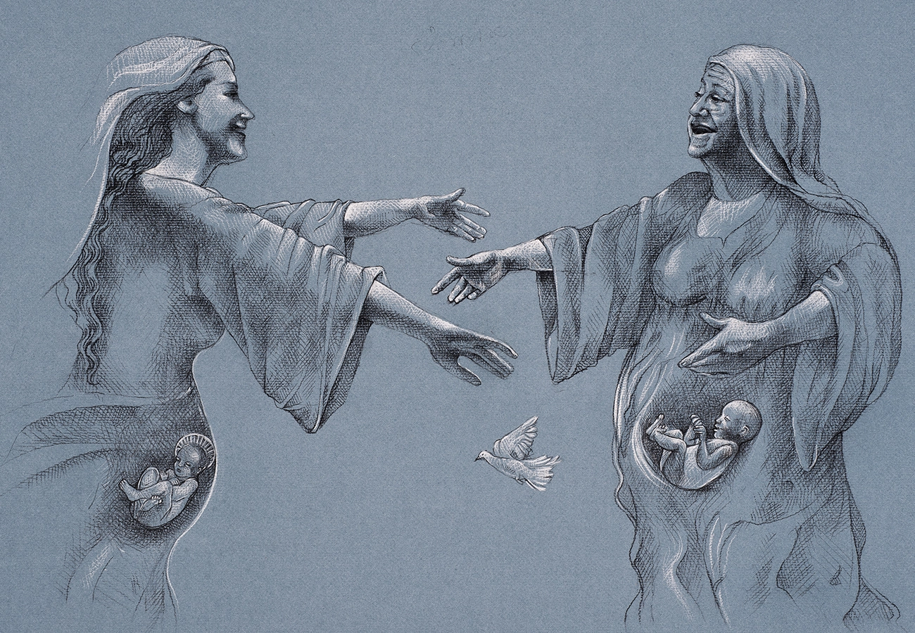 Ce dessin fait partie d’un ensemble d’une trentaine d’œuvres inspirées de l’enfance de Jésus et de Jean Baptiste. Pour créer ces images, l’artiste met en pratique les « Exercices dans la vie courante » dans l’esprit de saint Ignace de Loyola, et tente de visualiser les scènes de l’Évangile à l’aide des sens et de détails concrets. Dans La Visitation, elle illustre ainsi une jeune Marie toute joyeuse, s’élançant gracieusement vers sa cousine d’âge mûr qui l’accueille les bras ouverts. La colombe de l’Esprit saint, qui vole entre deux ventres laissant voir les enfants à naitre, rappelle que Jean Baptiste fut prophète dès le sein maternel, car il tressaillit en entendant la voix de la mère du Sauveur (Luc 1,41-44).