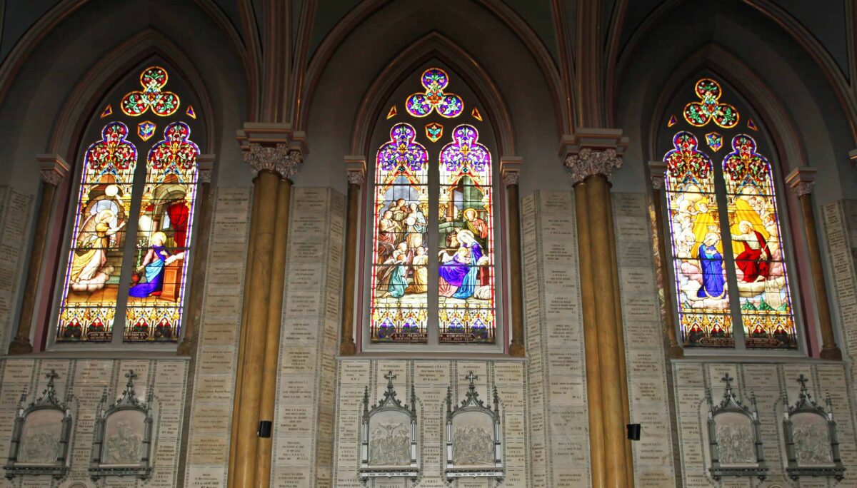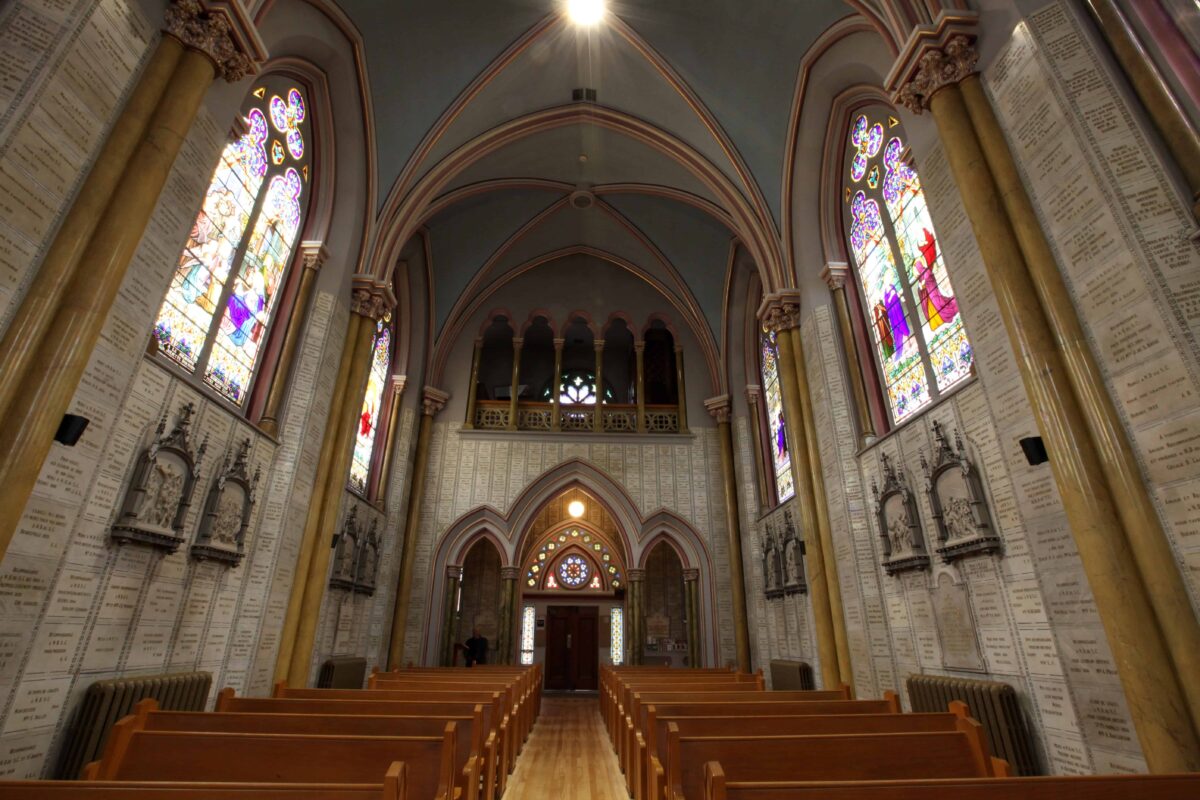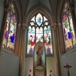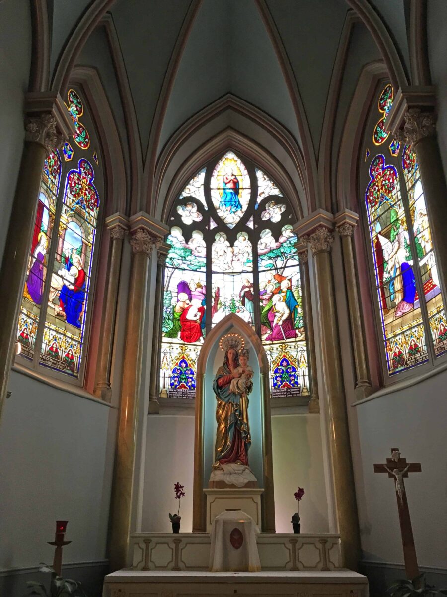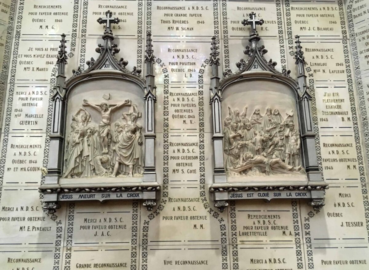 À l’intérieur, le regard est vite attiré par les murs recouverts de plaques de marbre qui tapissent entièrement la nef, une ornementation impressionnante de 930 exvotos en témoignage de faveurs obtenues. De plus, la richesse du coloris des vitraux, œuvre d’Henri Perdriaux (1877-1950), donne à l’endroit une lumière ambiante apaisante.