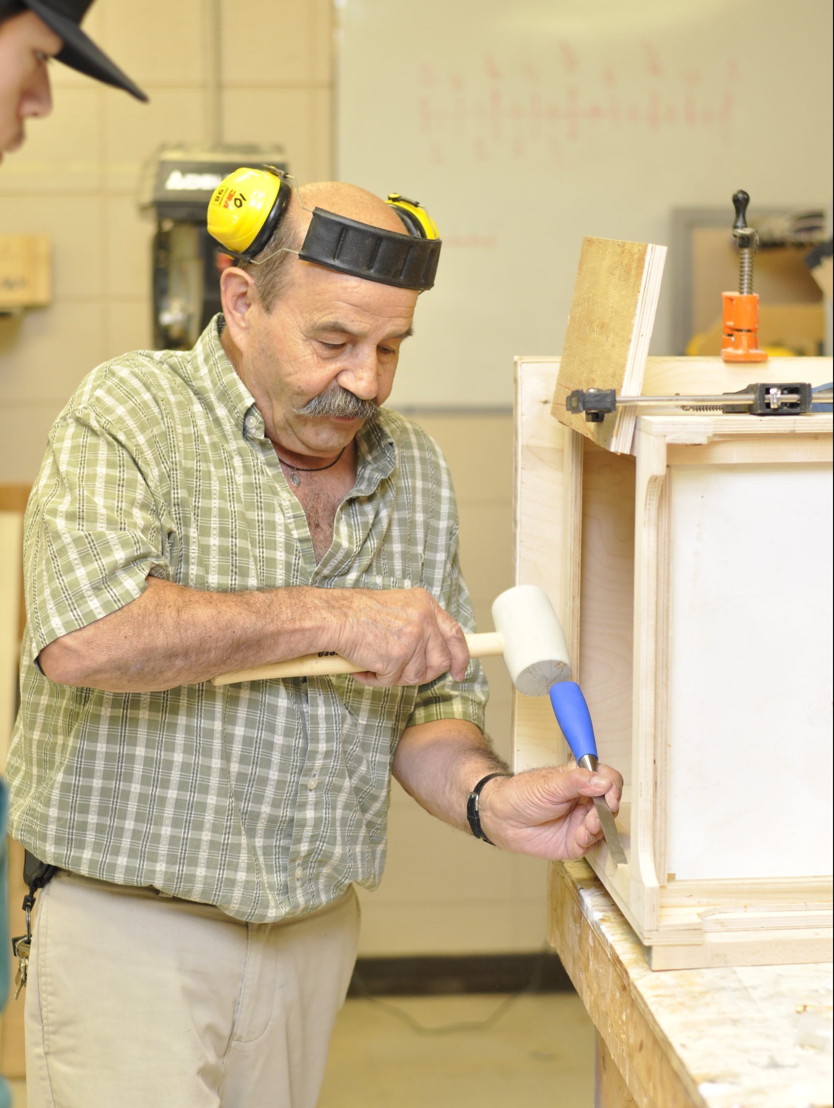 Alors qu’on se présente, il est penché sur son ouvrage. Affublé de lunettes de protection surplombant une distinctive moustache, l’homme lève la tête brusquement, salue en souriant, et retourne à sa besogne. Son élève, tout aussi concentrée, semble manier une scie circulaire pour la première fois de sa vie. On comprend que, pour le professeur, pas question qu’elle rate sa cible.