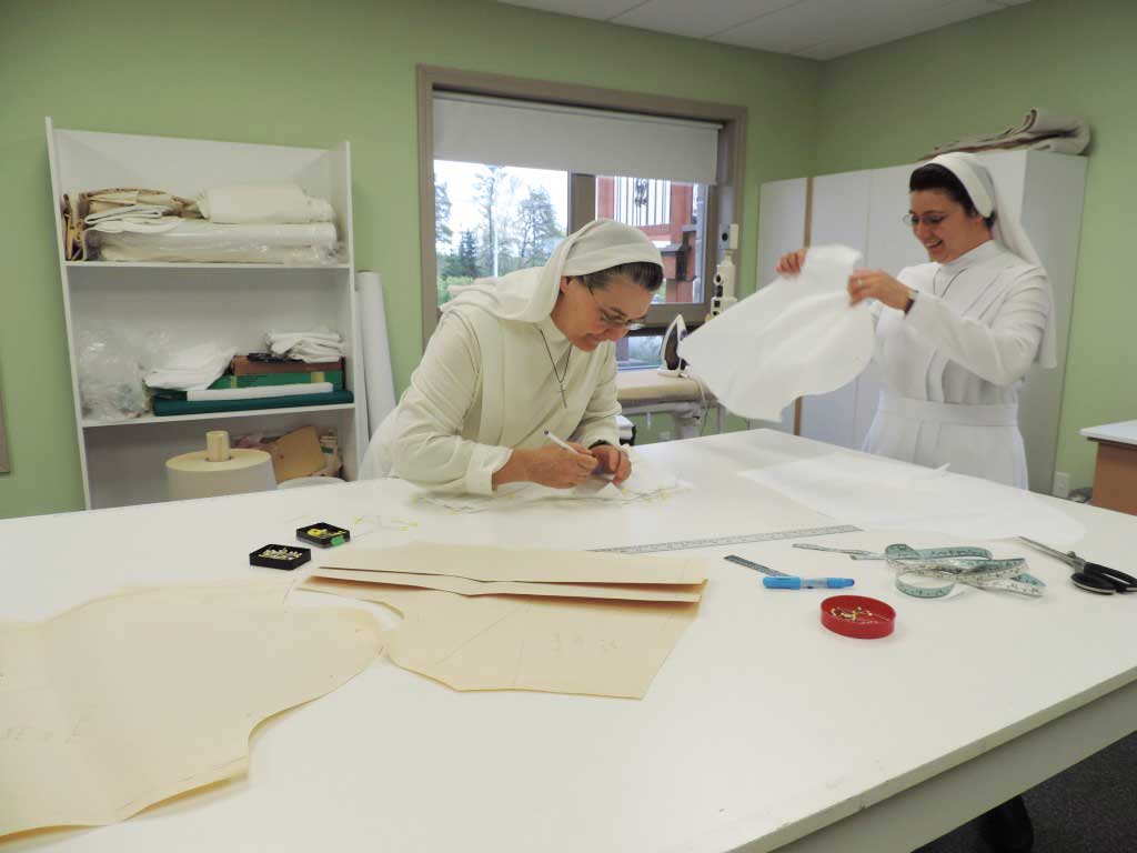 Une salle de couture est aussi mise à la disposition des résidents. Quand j’y suis entrée, sœur Nilda et sœur Marie-Thérèse se penchaient sur des patrons tout en veillant sur un petit chiot qui, manifestement, n’était pas très content de nous voir entrer dans son secteur.