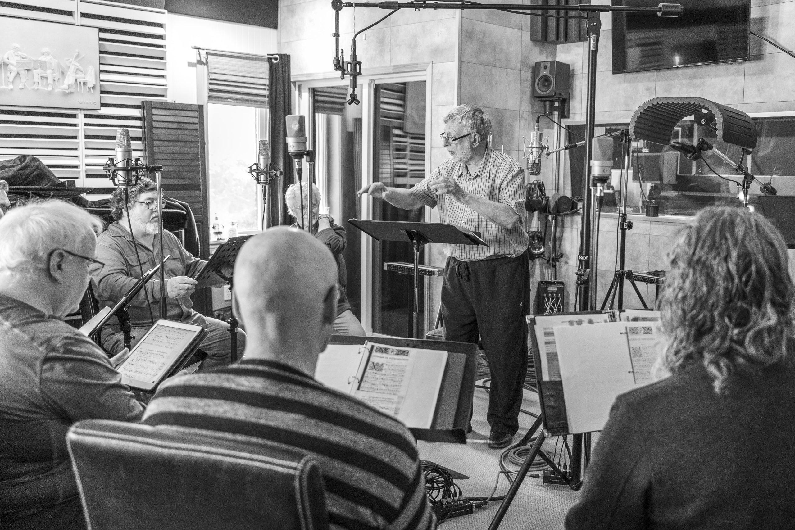 À la fin d’avril, huit voix masculines chevronnées de la capitale se réunissent dans un studio de La Haute-Saint-Charles. Dans une élégante pièce insonorisée en bois, les hommes en noir sont disposés en demi-cercle. Au centre, devant son lutrin, le directeur musical Jean-Claude Picard donne ses instructions : « J’aimerais que ce soit beaucoup plus sur le timbre, beaucoup plus fondu. Ne diminuez pas l’intensité. »